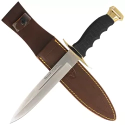 95-220 Black Rubber, Satin, large survival knife made of 420H stainless steel. The textured elastomer handle scales provide a comfortable and secure grip. Comes with a hand-stitched leather sheath. A perfect fusion of tradition and modernity in one tool!