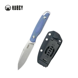 Dust Devil Blue Micarta, bead-blasted compact fixed-blade knife with full tang design by K.C. Spiron. Blade made of vacuum-hardened and ice-hardened Sandvik 14C28N steel, grips made of Micarta composite. Includes Kydex sheath with fastener.