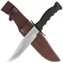 95-181 Black Rubber, Satin large survival knife made from 420H steel. Handle scales crafted from flexible, textured elastomer ensure a comfortable grip. Hand-stitched leather sheath. Perfect blend of tradition and modern design in one versatile tool!