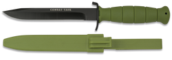 Combat Task Olive ABS, Black 3Cr13MoV tactical knife inspired by the Glock design. Features a clip point blade with black coating and a textured olive ABS handle. Comes with a molded sheath for belt or gear attachment.