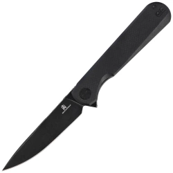 Flick Black G10, Black Stonewashed, an EDC folding knife designed by Ostap Hel, with a drop point blade in D2 tool steel and a G10 composite handle. Liner lock, styling based on principles of utility geometry.