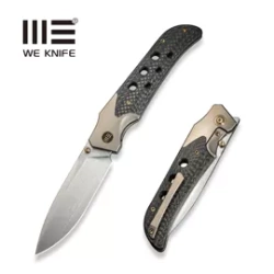 WE-Guthrie Champagne Titanium/Twill Carbon Fiber, Hand Rubbed Satin, a large EDC folding knife designed by Jason Guthrie. Comfortable Handle with titanium bolsters and carbon fiber, utilitarian 20CV CPM steel Blade, strong construction.