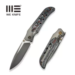 WE-Guthrie Black Titanium/Rose Carbon Fiber, Black Stonewashed, a large EDC folding knife designed by Jason Guthrie. Comfortable Handle with titanium bolsters and carbon fiber, utilitarian 20CV CPM steel Blade, strong construction.