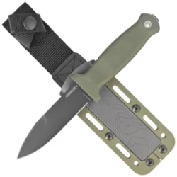 Armiger 4 Spear Point OD Green Thermal Plastic Rubber, Black Powder Coated, compact boot knife. Full tang construction, comfortable Handle for a secure grip. Sheath made of kydex. Designed by Cold Steel's longtime designer, Andrew Demko.