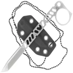 Sigurd Tanto Gray Steel, Satin, an extremely lightweight knife with a fixed blade, neck type. Blade made of Sandvik 14C28N stainless steel for good sharpness retention. Skeletonized type handle. Flat kydex sheath with chain for wearing around the neck.