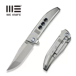 Ezinta Polished Gray Titanium, Polished Gray large EDC folding knife from the WeKnife manufactory. Long clip point blade made of Böhler M390 steel, monolithic handle milled from a single block of titanium. Excellent whole-hand grip and two ways of opening