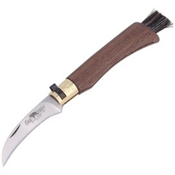 Mushroom Walnut 190mm, a folding knife for mushroom pickers with a mushroom cleaning brush from Antonini Old Bear. Equipped with Hawkbill profiled main blade, brush for cleaning mushrooms from needles and soil. Walnut handle grips.