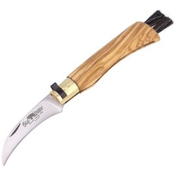 Mushroom Olive 190mm, a folding knife for mushroom pickers with a mushroom cleaning brush from Antonini Old Bear. Equipped with Hawkbill profiled main blade, brush for cleaning mushrooms from needles and soil. Walnut handle grips.