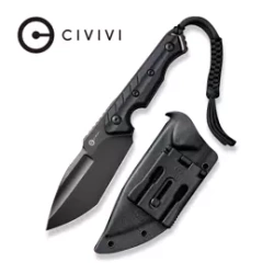 Midwatch Black Micarta, Black Stonewashed, a small EDC knife with a fixed blade. The thoroughly utilitarian shape of the blade made of N690 steel, handle made of burlap micarta, sheath made of kydex, equipped with a T-Clip allowing attachment to the belt.