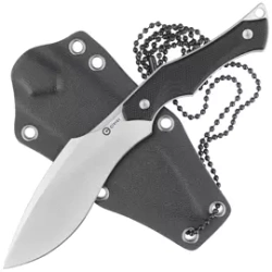 Vaquita II Black G10, Satin, nieduży nóż EDC o stałym ostrzu projektu Nate'a Matlacka. Kształt ostrza nawiązujący do kukri ze stali Nitro-V, rękojeść z G10. Pochwa z kydexu, z możliwością mocowanie do pasa, łańcuszek kulkowy do zawieszenia na szyi.