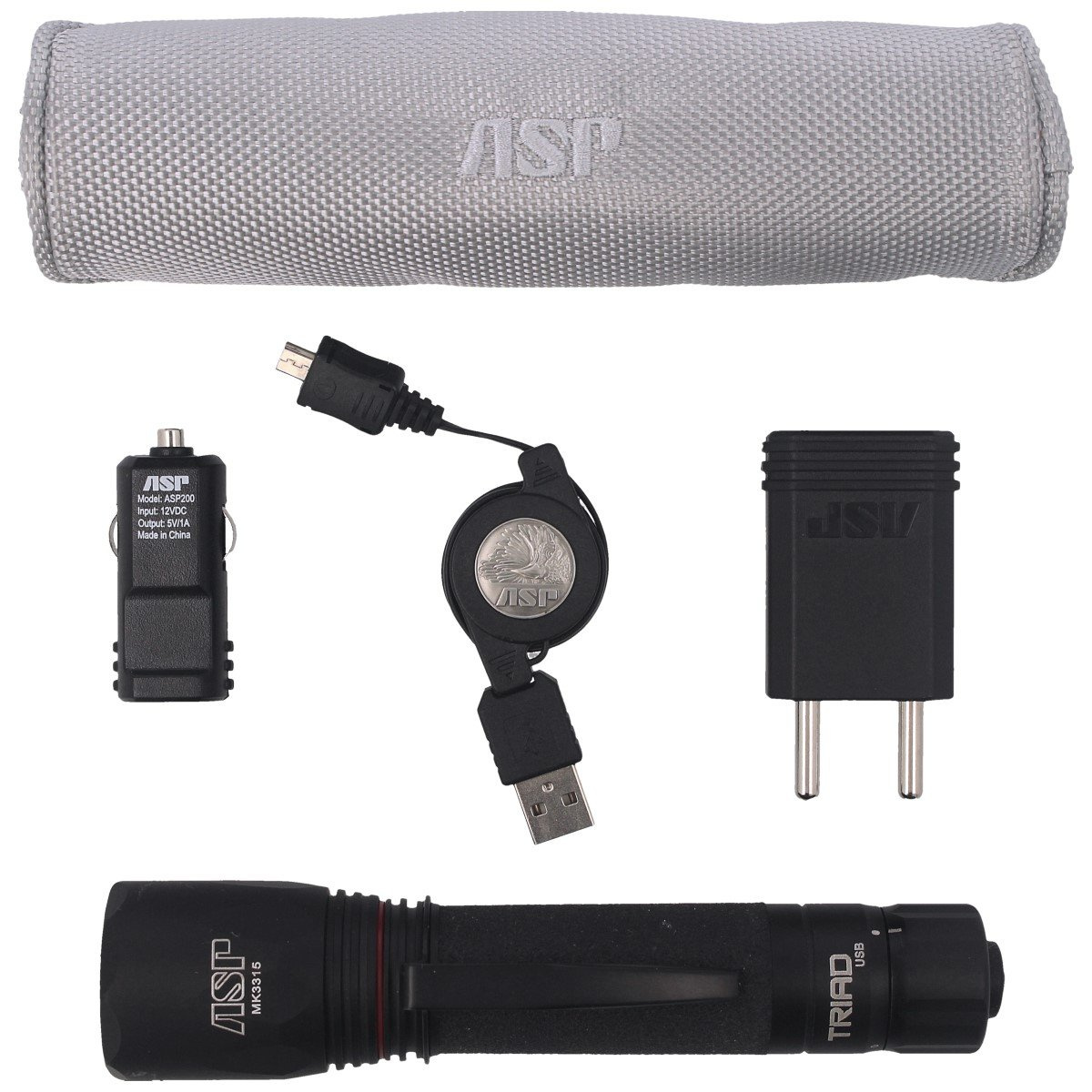 - TRIAD USB professional tactical rechargeable flashlight by the ASP company specializing in the production of tactical equipment for uniformed services. The smooth reflector ensures a perfect outer ring, inside which it finds an intensely glowing center.