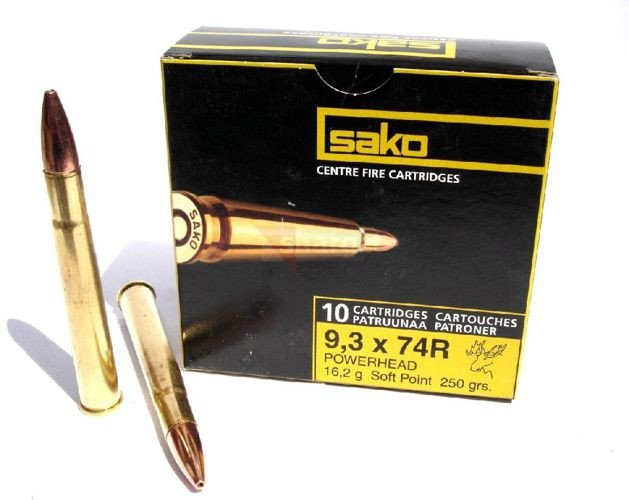 - (477D 9.3x74R), Sako hunting ball ammunition in 9.3x74R caliber. Bullet weight 250 Grain, package of 20 rounds.