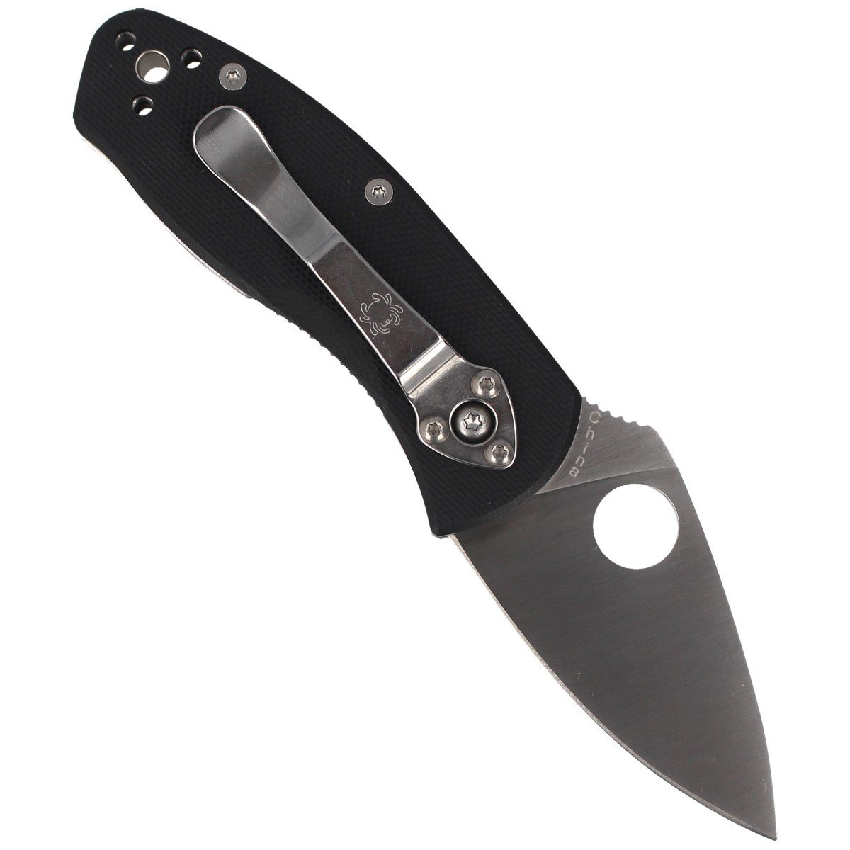 Blade - with a wide curved Leaf Shaped profile, 3.1 mm thickness, provides excellent cutting edge geometry at low friction. The cutting edge was made with a full flat cut (Full Flat Grind). Smooth blade (Plain type) extends over the entire length of the blade, enabling powerful blade heel cuts. The blade is made of 8Cr13MoV sharp stainless steel (equivalent to Japanese AUS-8 steel). Careful placement of a 14 mm round SpyderHole cut-out on the blade (Spyderco patent) sets the hand for intuitive opening of the blade and at the same time increases the spine support hinge for spine jimping.