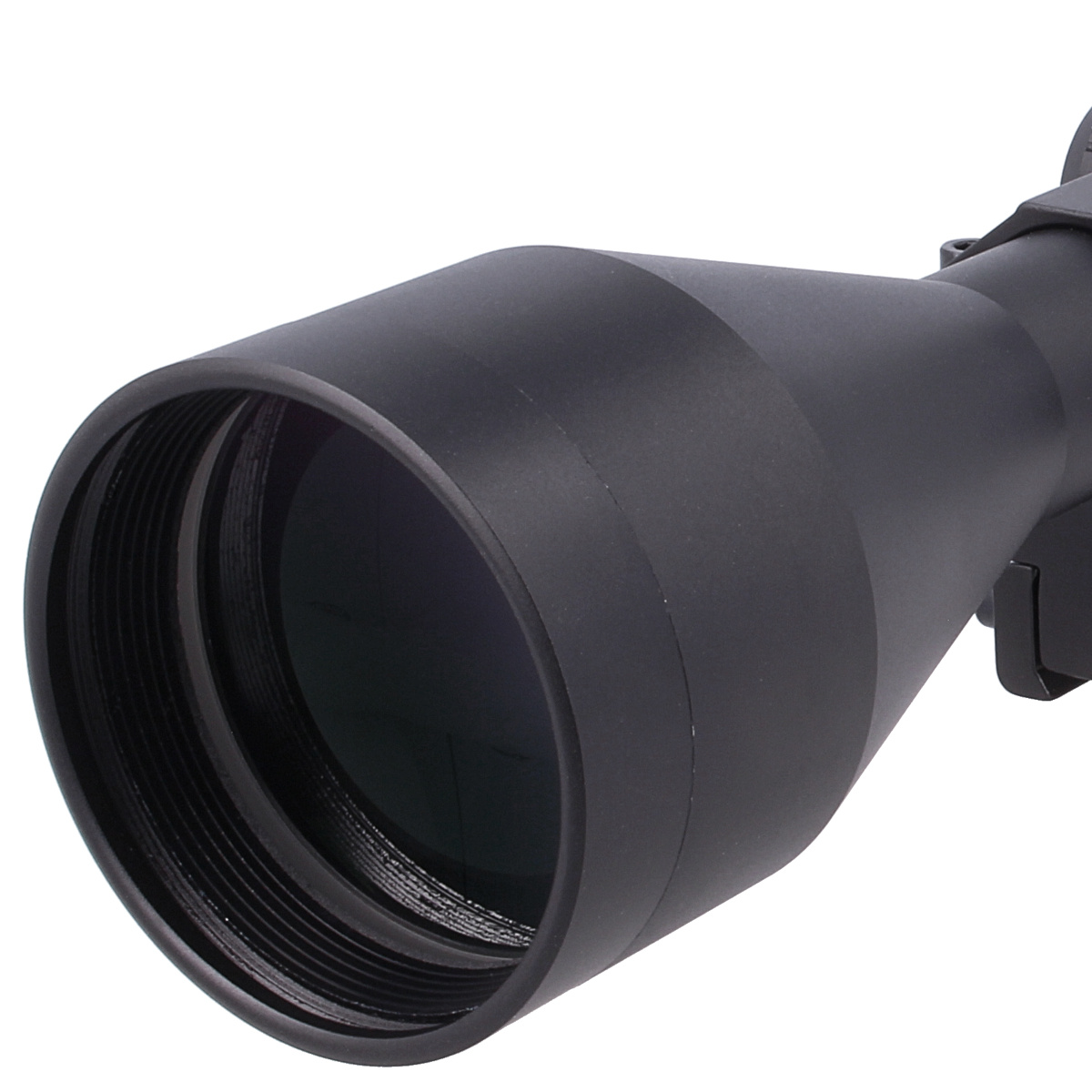 Siatka celownicza - składa się z nie zasłaniającego celu cienkiego krzyża numer 4, trzech grubszych belek oraz z centralnie podświetlanego na czerwono punktu Red Dot z 11 stopniową regulacją jasności. Rozmiar siatki pozostaje zawsze taki sam, pomoże namierzyć cel nawet w warunkach szczątkowego oświetlenia. Jeden z najbardziej popularnych krzyży używanych w celownikach optycznych.