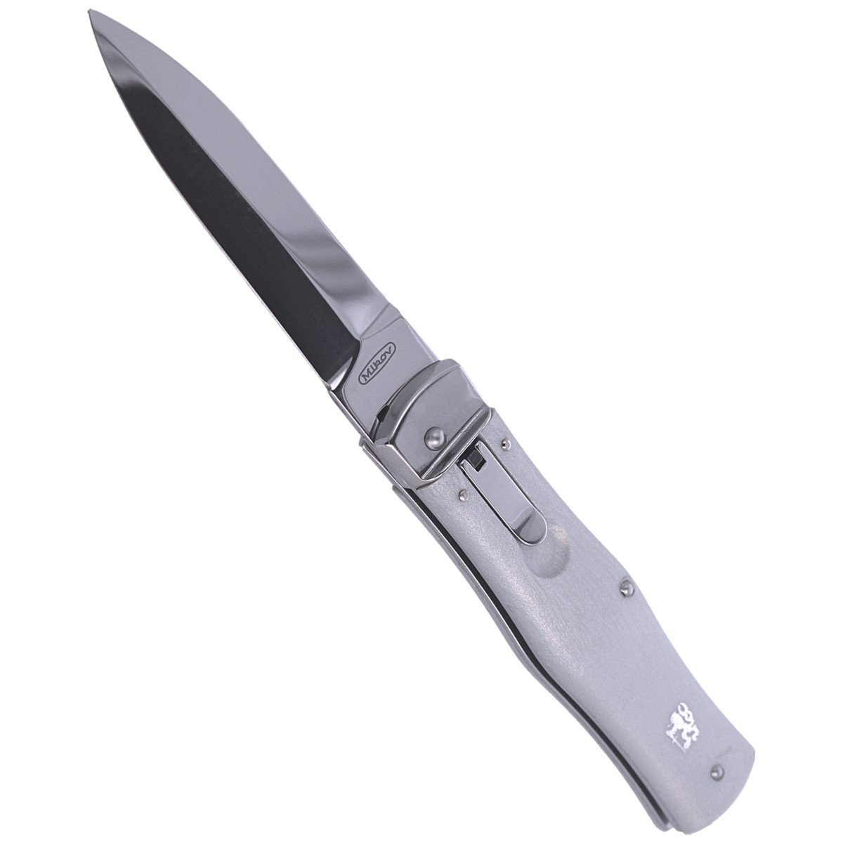 Predator ABS Gray, Clip automatic knife type swichblade from the Czech company Mikov from Mikulasovic with a clip and ABS facings in gray pearl color. This region has specialized in the production of cutlery since 1794, being called "Czech Solingen".