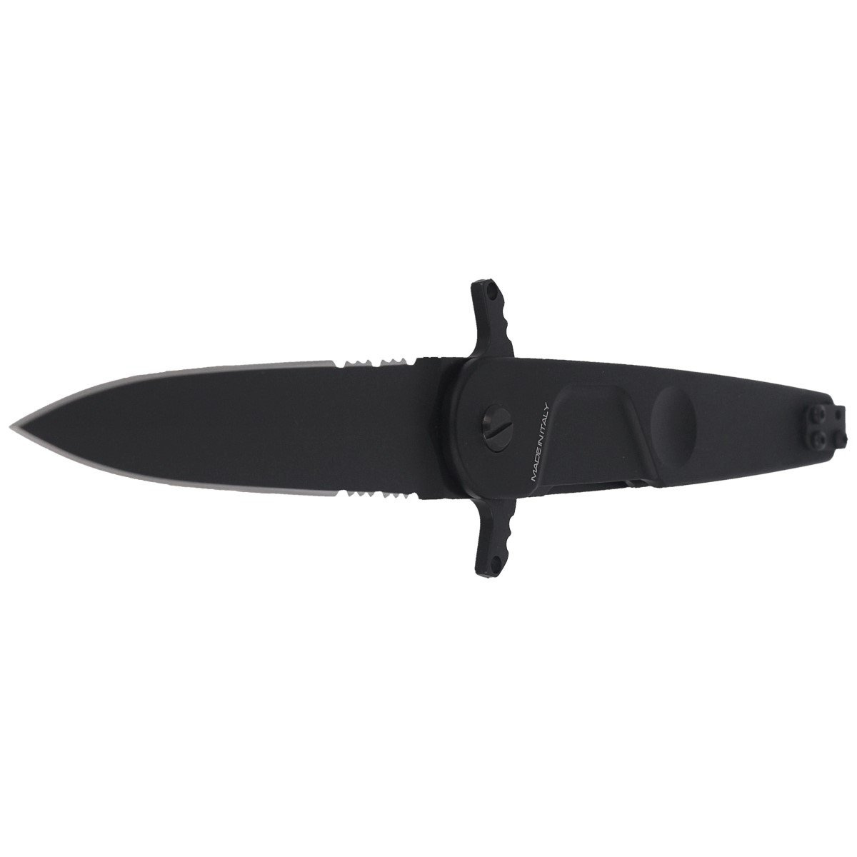 Blade - slim, extremely sharp of profile Leaf-Shaped (leaf shape) with a double-edged symmetrical blade, provides excellent cutting edge geometry with low friction. Sides of the blade with a short saw for aggressive cutting. Coated with matte non-reflective coating MIL-C-13924 BURNISHING. Smooth blade on both sides Plain brought out flat grind (Flat Grind) provides durability and extreme cutting and penetration performance. Robust mechanism Liner-Lock. Double-sided (double guard) notched hilt for the quick opening of the wedge and ohand protection.