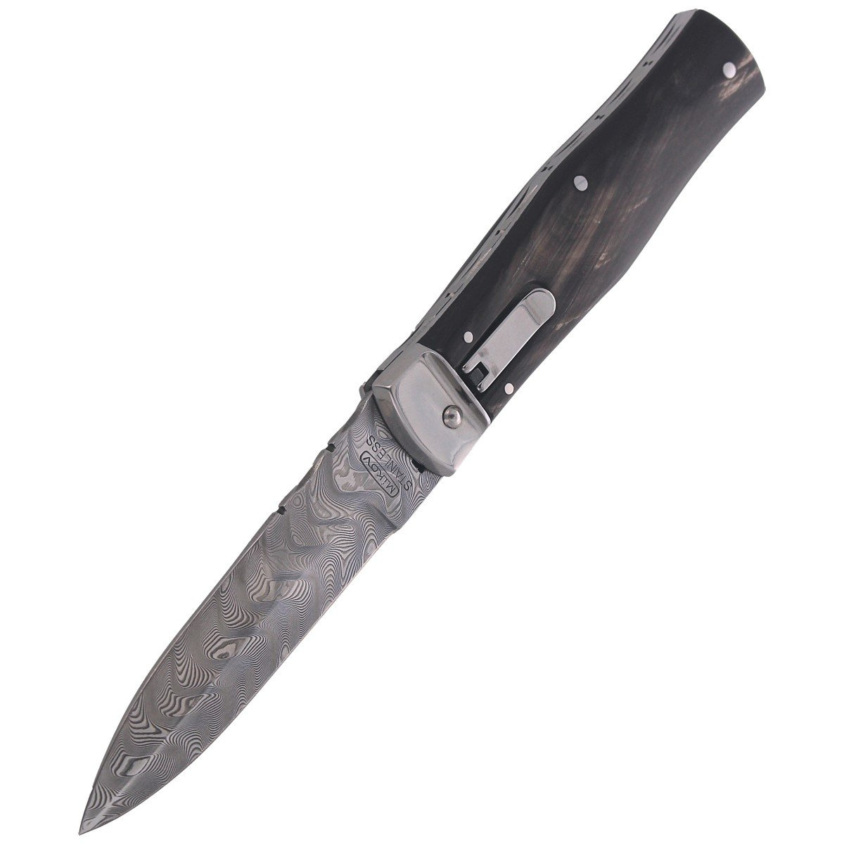 Predator Wildcat Damascus, Buffalo Horn an artful version of the automatic knife (swichblade) from the Czech company Mikov of Mikulasovice with with a damascus steel blade and polished buffalo horn handle. The Mikulasovice region has specialised in the production of knife products since 1794, being called the "Czech Solingen". A knife for collectors, people who appreciate excellent design and beauty of the objects they surround themselves with.