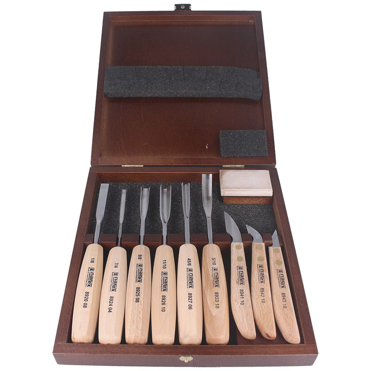 894813, 9 elements high quality set of carving knives and chisels Narex Standard packaged in an elegant wooden box. Includes basic profiles of carving chisels and knives designed for amateur wood carving work. The set additionally includes a flat stone for sharpening.