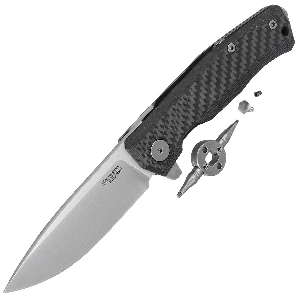 Myto Carbon Fiber, Satin a high-tech Hi-Tech folder with a durable frame-lock. An exceptional E.D.C. knife by the Italian LionSteel manufactory. Features M390 sintered steel blade, "ReF" on the underside of the blade, Double Crown ball bearing system and titanium clip. Comes with LionSteel Hand (#HY 68), Torx T6, Torx 8 adjustment wrench along with Hex wrench for glass breaker screw.