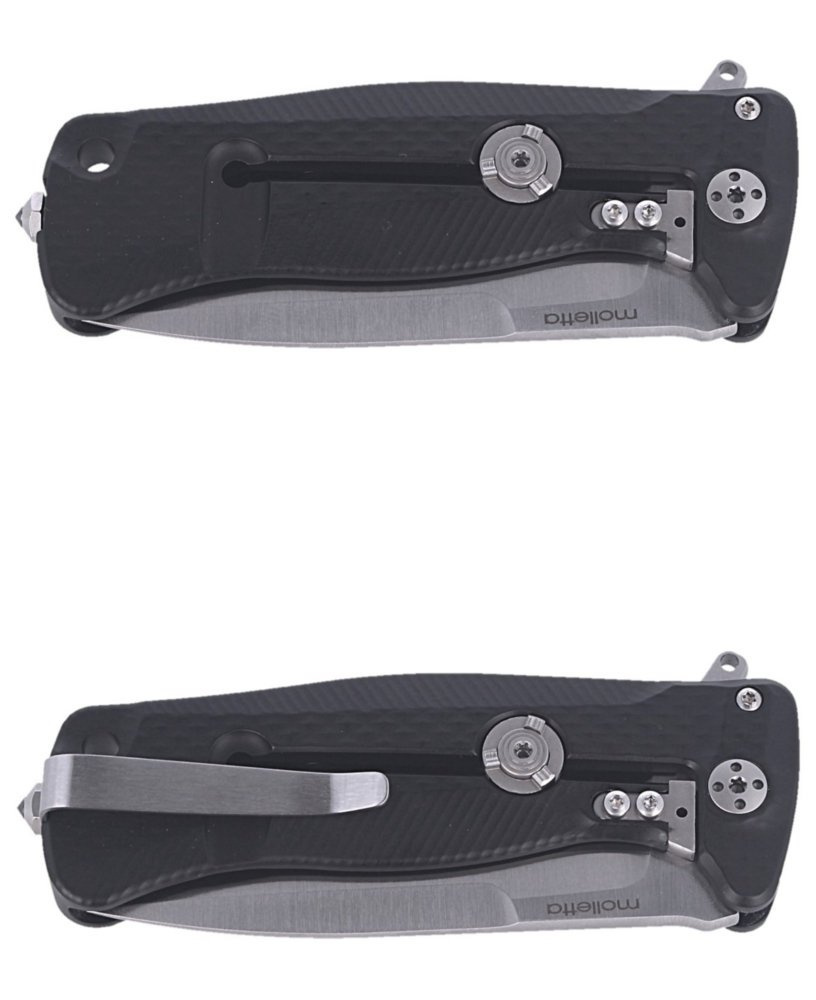 RotoLock - lock with patented additional locking mechanism in the shape of titanium shield by Gianni Pauletta. When the knife is open, turning the RotoLock about 1/8 of a turn clockwise wedges the locking mechanism, preventing unintentional release of the blade lock, provides the same stability of the blade as in knives with a fixed blade.