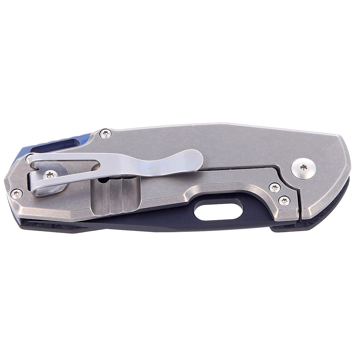 Handle - on one side a thick piece of black Carbon Fiber (carbon fiber pressed under pressure with synthetic resin), on the other a titanium lining. The facings were bolted to a CNC-milled blue anodized titanium backspacer, which means that such a design is virtually indestructible. Right and left side, two-position deep carry clip allows you to carry the knife discreetly in tip-up position. At the end of the handle lanyard hole, a rope hole.