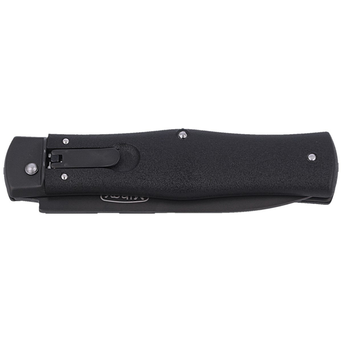Predator Blackout Black ABS, Black DLC automatic knife (swichblade) by the Czech company Mikov from Mikulasovice with a blade made of N690 steel, coated with DLC. The Mikulasovic region has specialised in the production of knife products since 1794, being called the "Czech Solingen".