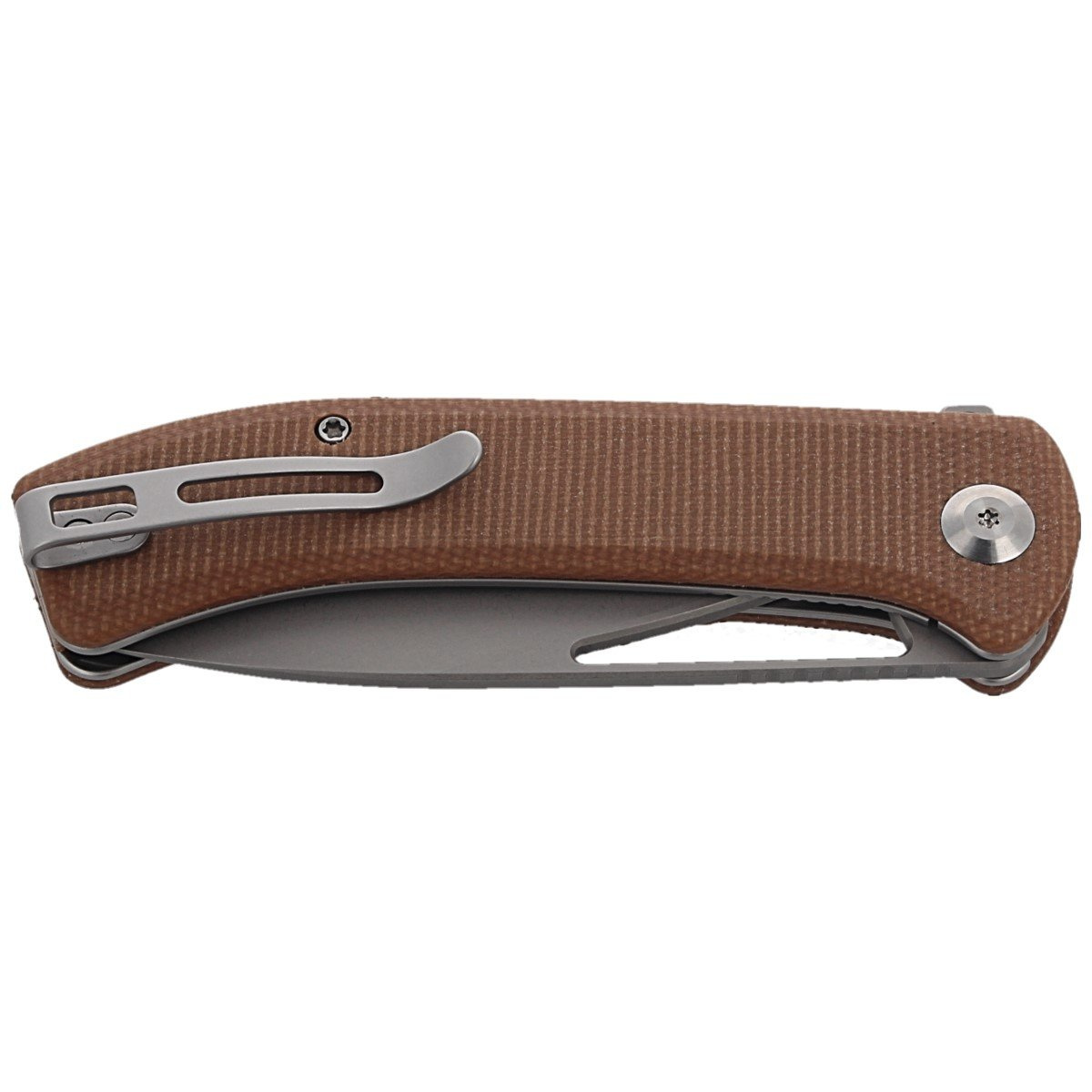 The handle is made of brown micarta. The surface is smooth, but with a noticeable texture that improves grip. The whole is screwed to steel liners. In practice it means many years of work without weakening the construction. Two-position, left- and right-handed deep carry clip allows you to carry the knife in tip-up position. In the back there is a hidden recess for attaching a safety or decorative cord. As in other models, the pivot is decorated with stylized manufacturer's logo.