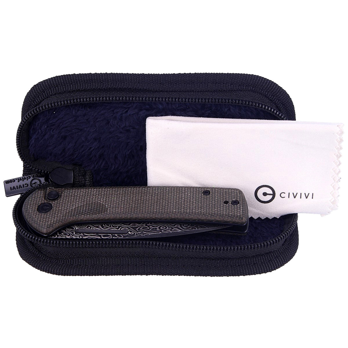 Handle - green color. Made of Micarta, a fabric compressed under pressure with resin. Chamfered cover edges eliminate sharp edges for comfort and improve grip. Open-backed design attached with steel spacer sleeves reduces weight and makes it easy to clean. The pivot is decorated with a stylized Civivi brand logo. Two-position, right/left deep carry clip allows you to carry the knife discreetly in your pocket in tip-up position.