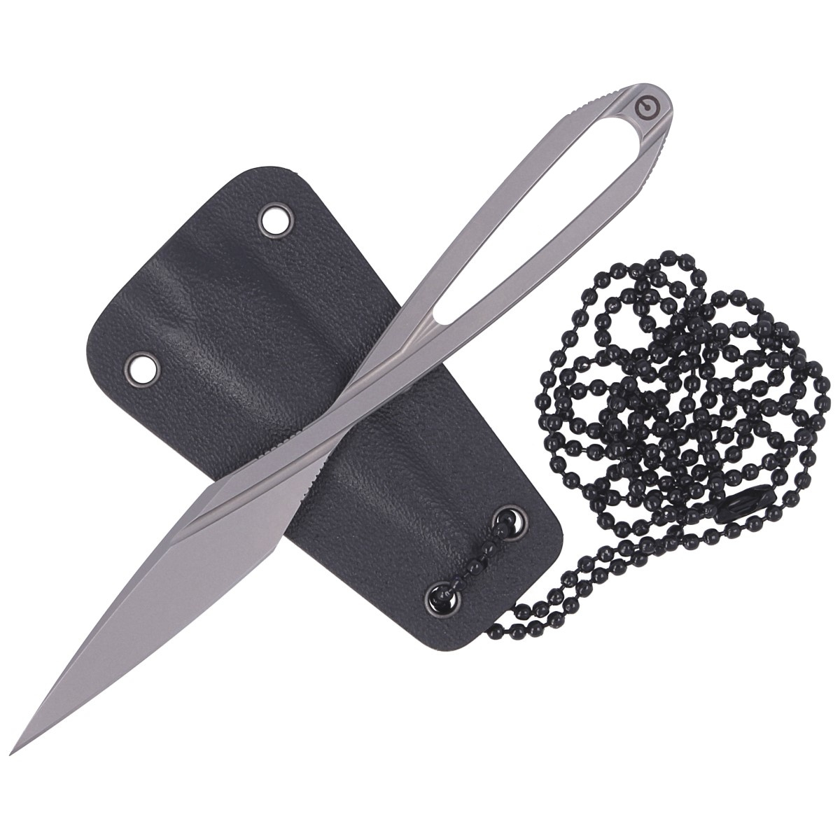 The set includes black kydex sheath which can be worn around the neck with included chain. Thanks to holes at the edges of the scabbard you can also strap the knife to your equipment with paracord or Tek-Lok.