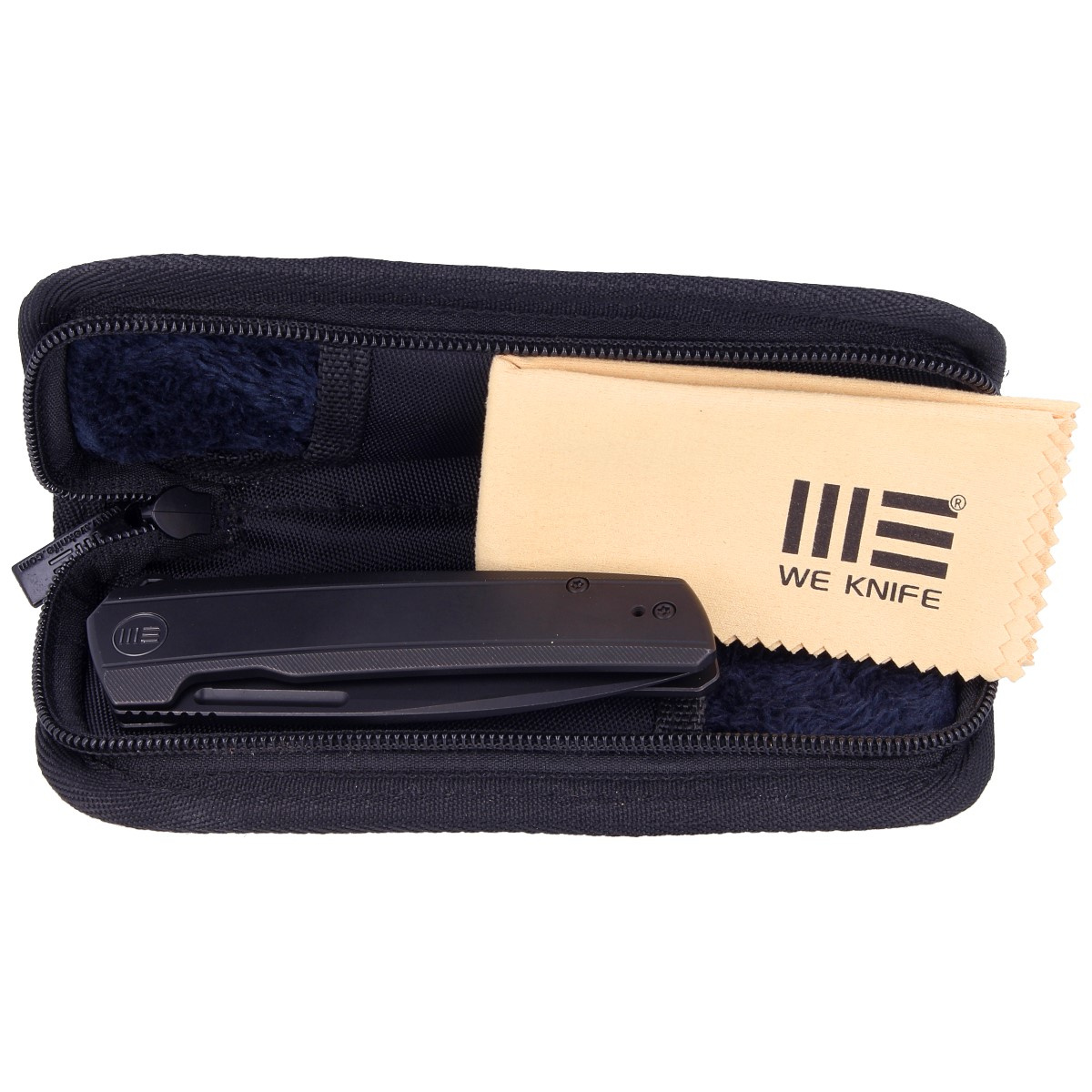Two pieces of solid titanium 6AL4V in black color. Chamfered edges and fine texture improve grip security. Open-backed construction with titan spacers reduces weight and facilitates cleaning. As in other WE models, the pivot is decorated with a stylized manufacturer's logo. The left/right titanium clip allows you to carry the knife in tip-up position, with the tip of the blade upwards.