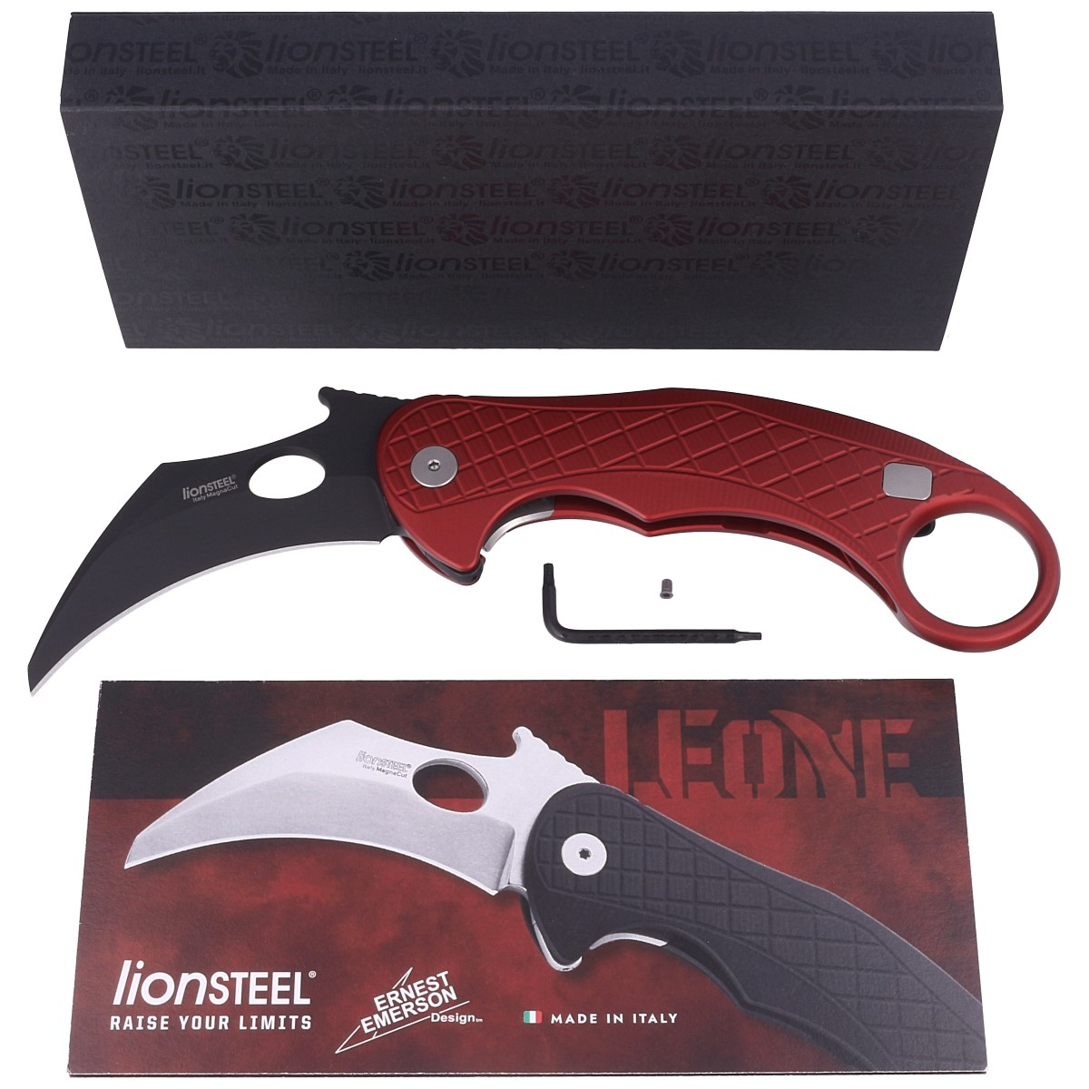 - L.E.One Karambit Red Aluminium, Chemical Black MagnaCut, the world's most technically advanced folding karambit! Lionsteel's patented technologies and unique Emerson Design!