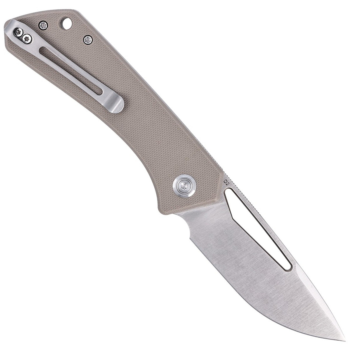 - Thalia Tan G10, Satin, an undersized EDC folding knife. Utility drop point Blade made of D2 tool steel, Front Flipper for opening and Handle made of virtually indestructible G10 plastic. This knife will never let you down! Bestseller!