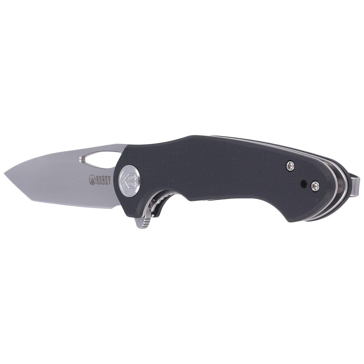 Handle - black G10 (pressure-pressed fiberglass with synthetic resin) facings,textured to improve grip security, bolted to the knife's steel frame. The whole screwed together with spacer sleeves. Simple, solid construction gives you the assurance of many years of use. A deep finger undercut (fore finger groove) improves grip security. The pivot axis is decorated with a screw with a stylized manufacturer's logo. A two-position (right and left) metal deep-carry clip allows you to carry the knife discreetly in your pocket in tip-up position. Hidden in the back of the handle is a place to thread a safety or decorative cord.