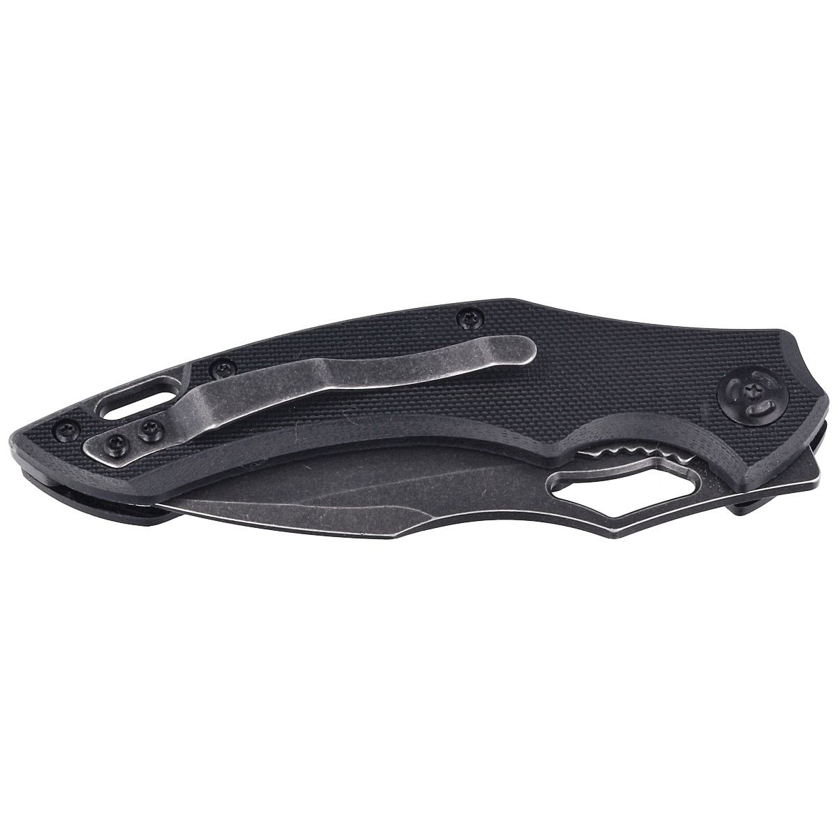 Handle - G10 plastic facings, fiberglass compressed with resin. screwed to a steel backspacer. The simple, secure design gives assurance of many years of use. A fore finger groove improves grip security. The pivot axis is decorated with a stylized screw. A single-position (right-side) metal deep-carry clip allows you to carry the knife discreetly in your pocket in tip-up position (blade tip up). In the backspacer lanyard hole, a hole for a safety or decorative cord.