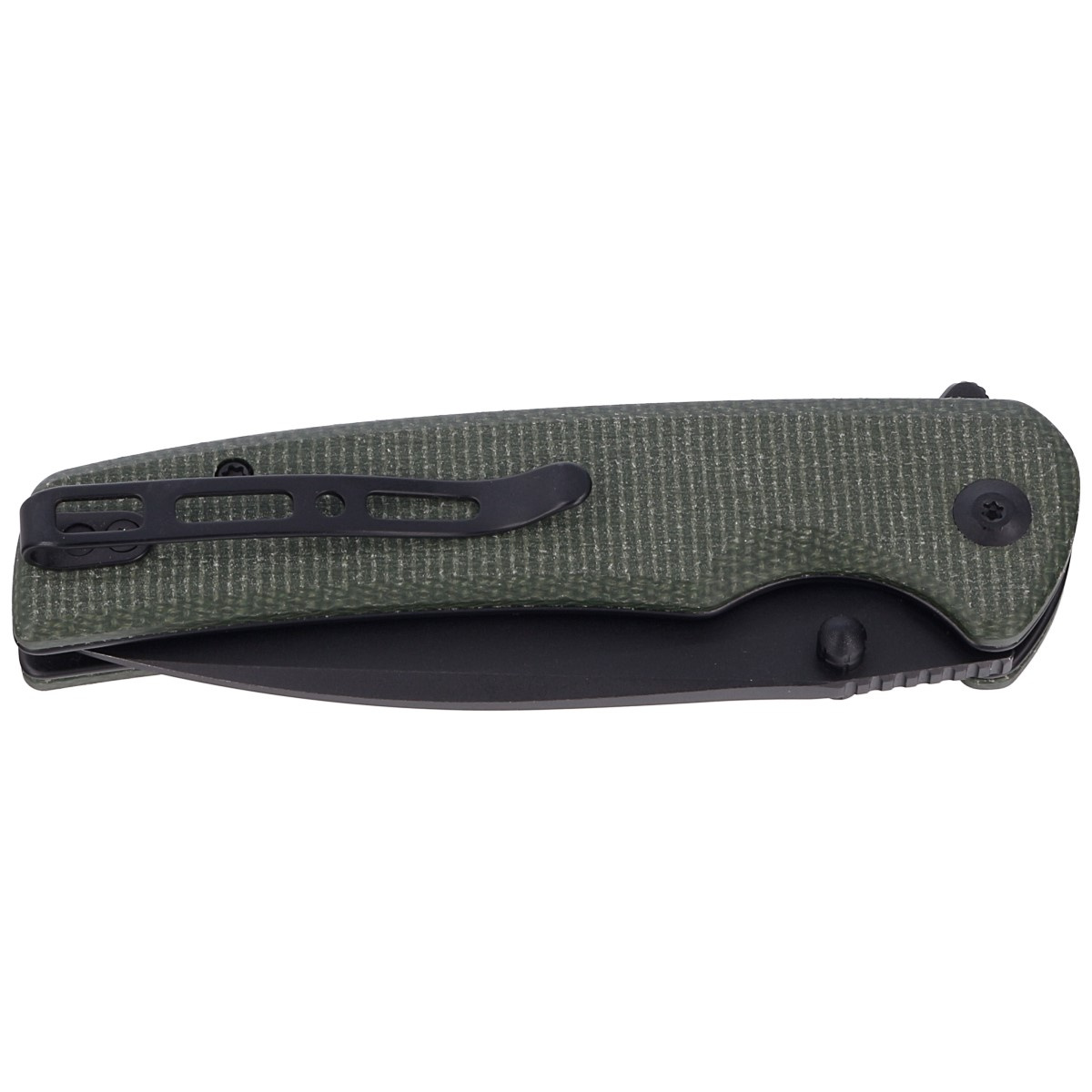 Handle - in green color. Made of micarta, a composite material of cotton or linen compressed under pressure with synthetic resin. Chamfered edges of the covers eliminate sharp edges for comfort, and jimping made on the front on the liners improves grip security. An open-backed design fixed with steel spacer sleeves reduces weight and facilitates cleaning. The two-position, right/left deep carry clip allows you to carry the knife discreetly in your pocket in tip-up position (tip of the blade upward).