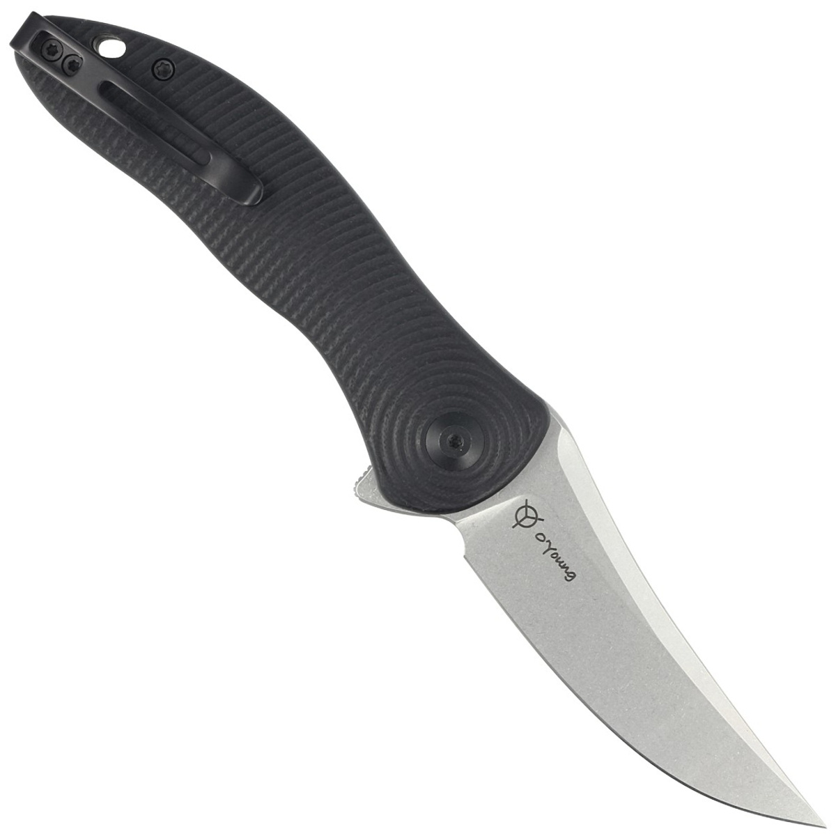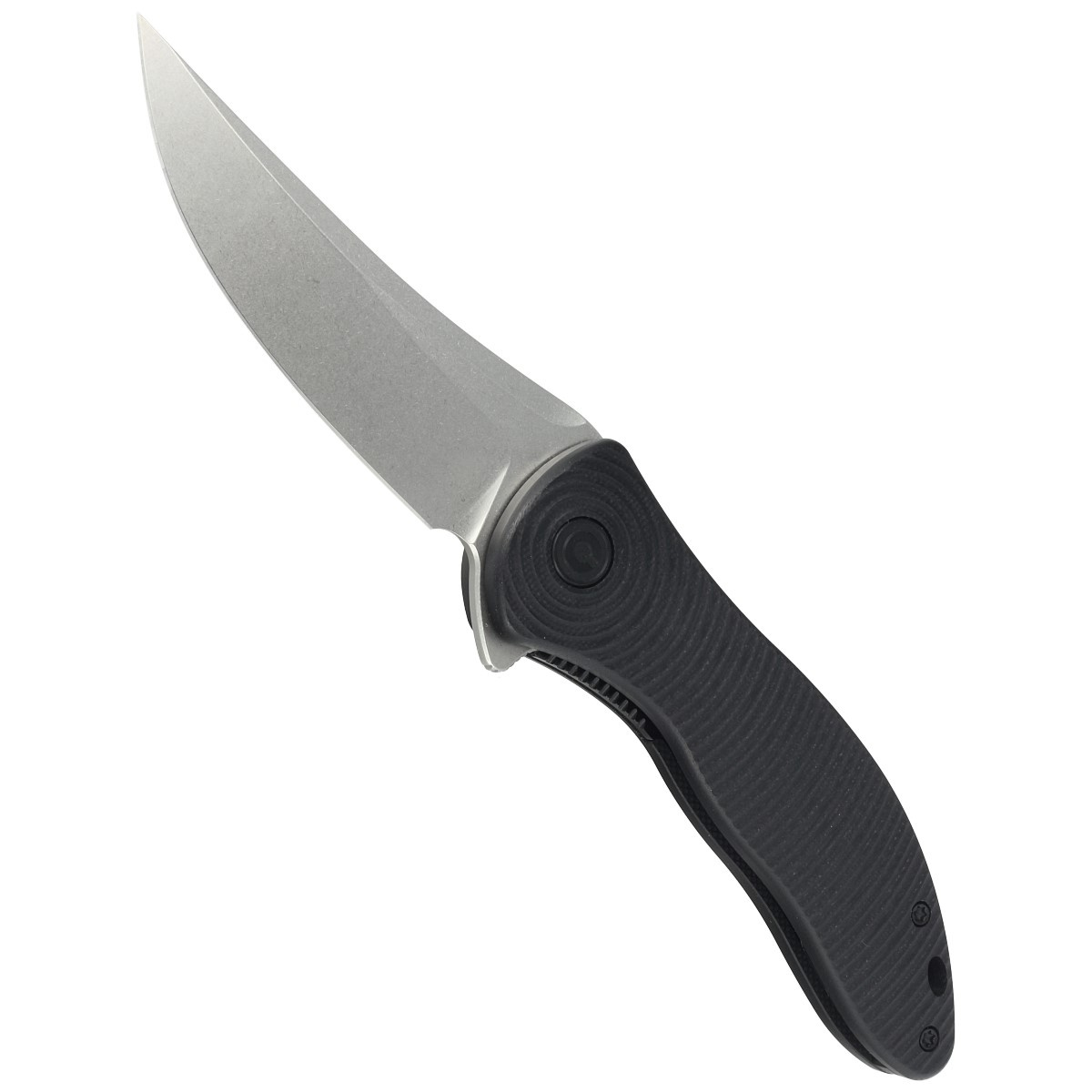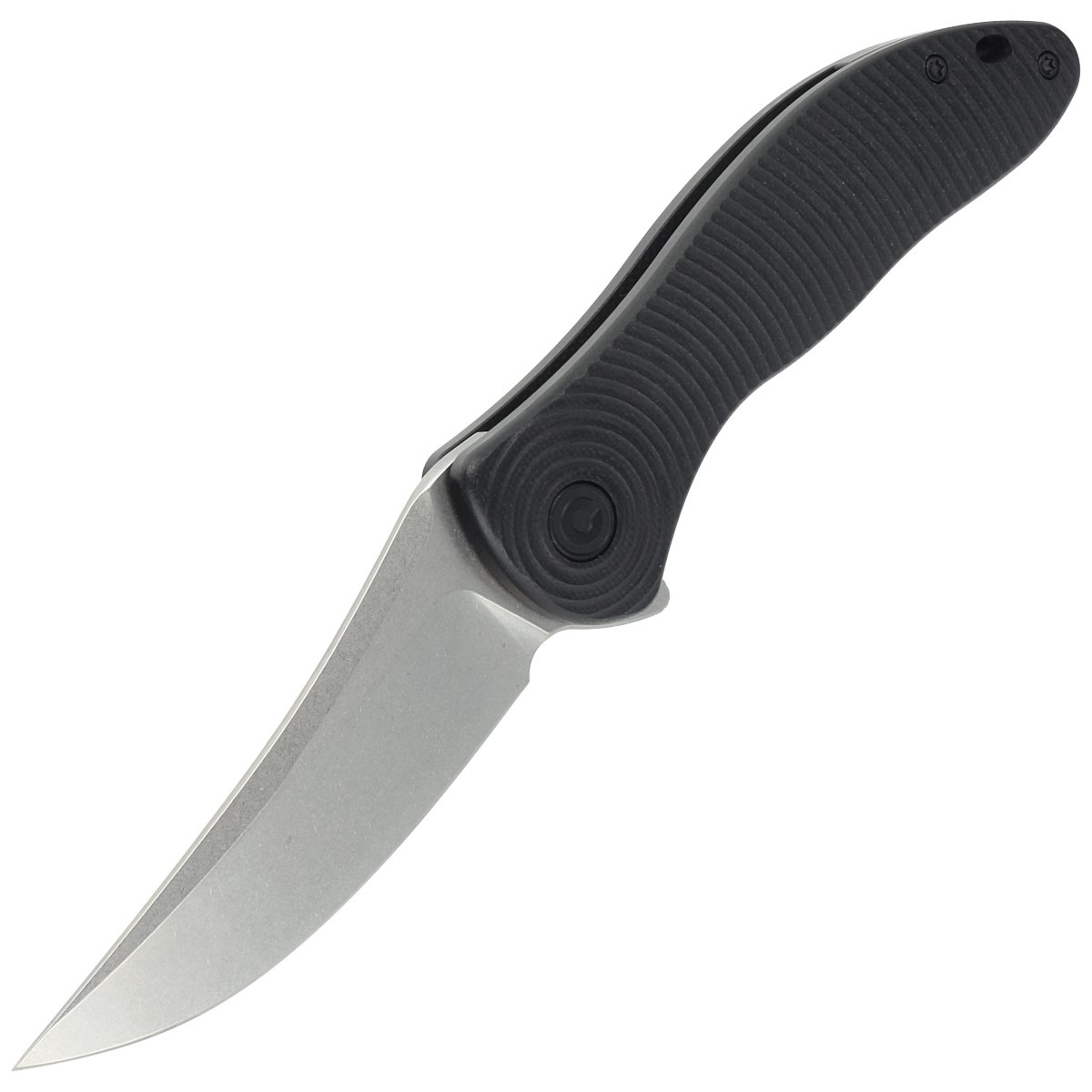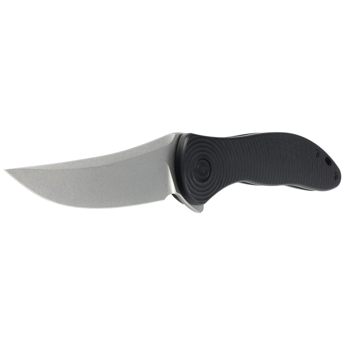 Handle - black G10, fiberglass facings pressed with resin, with a beautiful pattern of concentrically spreading circles. Chamfered edges of the covers eliminate sharp edges for comfort and improve grip confidence. The backspacer is made of the same material as the handle grips. The pivot is decorated with a stylized Civivi brand logo. A single-position, right-side deep carry clip allows you to carry the knife discreetly in your pocket in tip-up position (blade tip up).