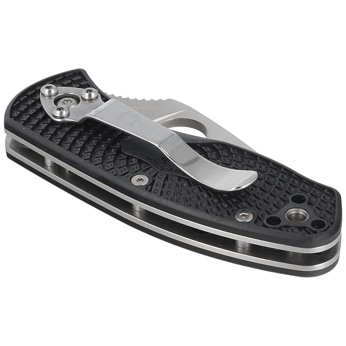 Handle - molded in black. Bi-Directional Texturing non-slip facings strengthen the grip, even with wet hands. Made of FRN (Fiberglass Reinforced Nylon), a fiberglass-reinforced nylon plastic. Metal hourglass clip with 4-way (up/down, right/left) 4-way clip positions. In the back of the handle lanyard hole, a hole for a cord.
