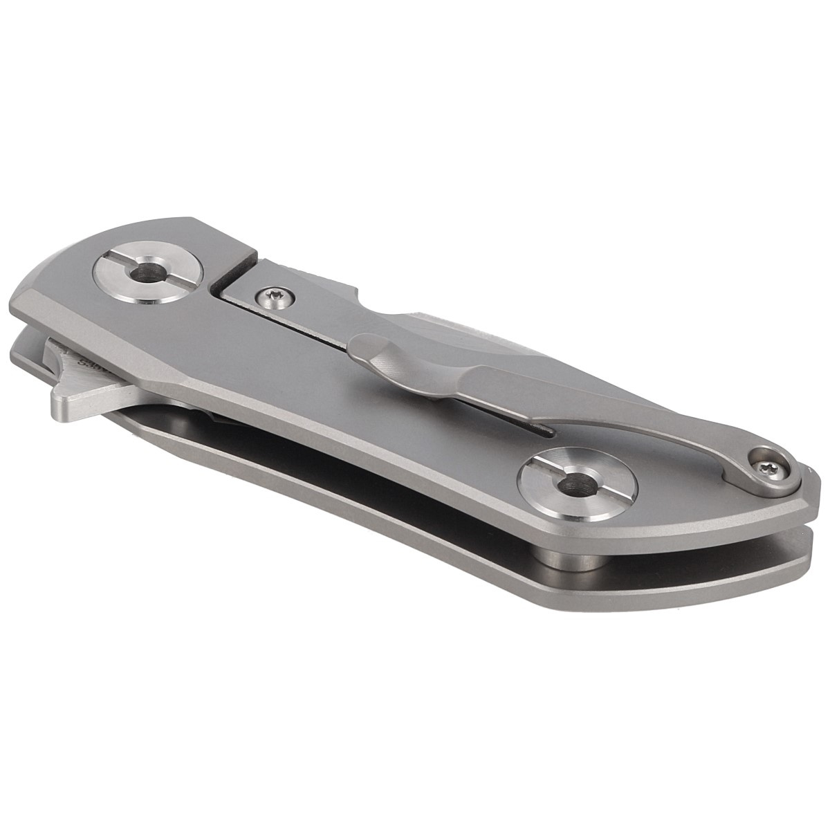 Handle - is two pieces of solid titanium 6AL4V. Chamfered edges of the covers eliminate sharp edges for comfort and improve grip security. Characteristic of Jacob's designs are large screws attaching the grips to the spacers. The so-called open-backed design without the typical backspacer, fastened together with steel spacers for easy cleaning. The simple, secure design gives assurance of many years of use. A single-position, right-handed titanium clip allows the knife to be carried in the tip-up position , with the tip of the blade upward.