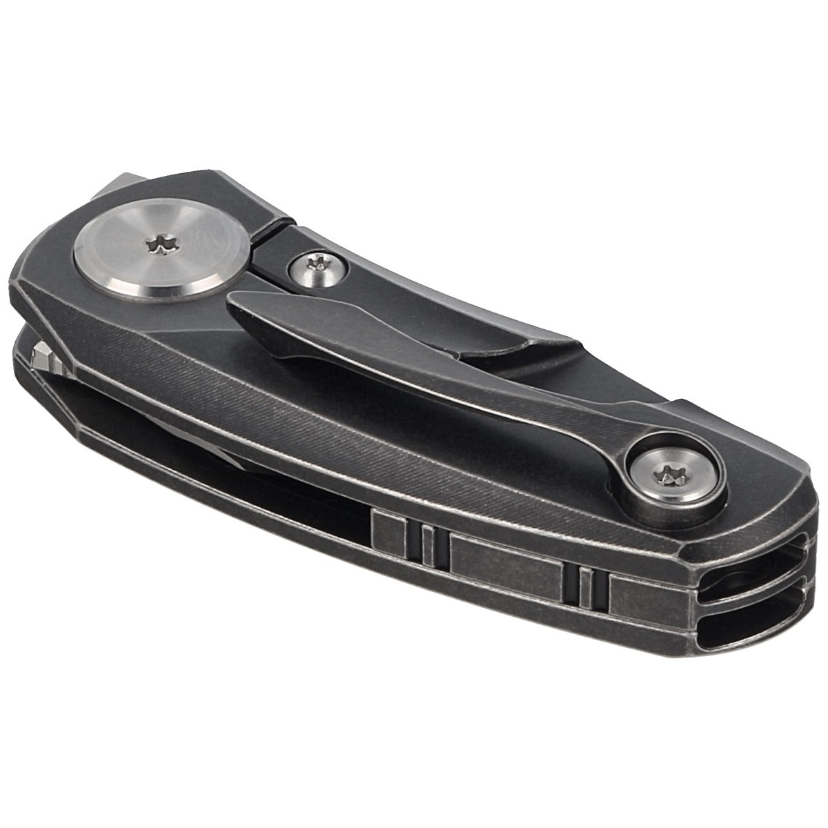 Handle - made of titanium 6AL4V, screwed to the backspacer, also made of titanium. Contouring of the cover eliminates sharp edges for a comfortable and secure grip. The simple, secure design gives assurance of years of use. A flat, low-profile, single-position (right) titanium clip allows the knife to be carried discreetly in the tip-up (tip up) position.