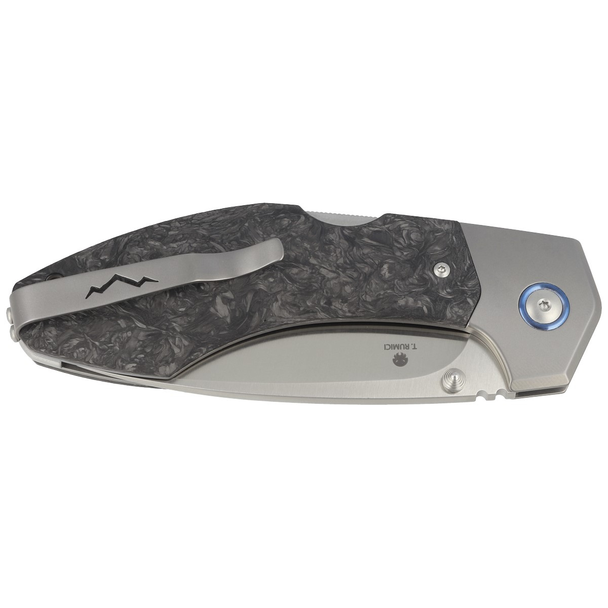 Handle - bolsters made of 6AL4V titanium, handle made of Marble Carbon Fiber, a carbon fiber with marble texture. Chamfered edges of the covers eliminate sharp edges. The facings are screwed to an intricately machined titanium backspacer, giving assurance of many years of use. A two-position (right/left) deep-carry clip allows you to carry the knife discreetly in your pocket in the tip-up (blade tip up) position. In the back of the handle a hole for threading a safety or decorative cord.