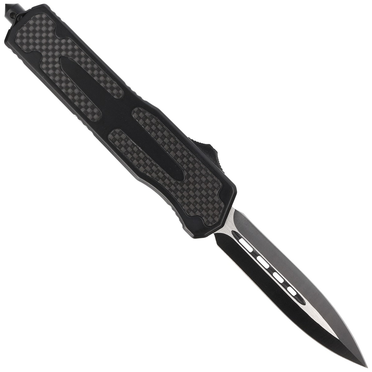 - Dulotec OTF Dagger Aluminum / Carbon Fiber, Two-Tone automatic OTF (Out The Front) knife operating in D/A (Double Action) mode, i.e. with a slider you extend and retract the blade. Strong construction, reliable operation and reasonable price. Bestseller!