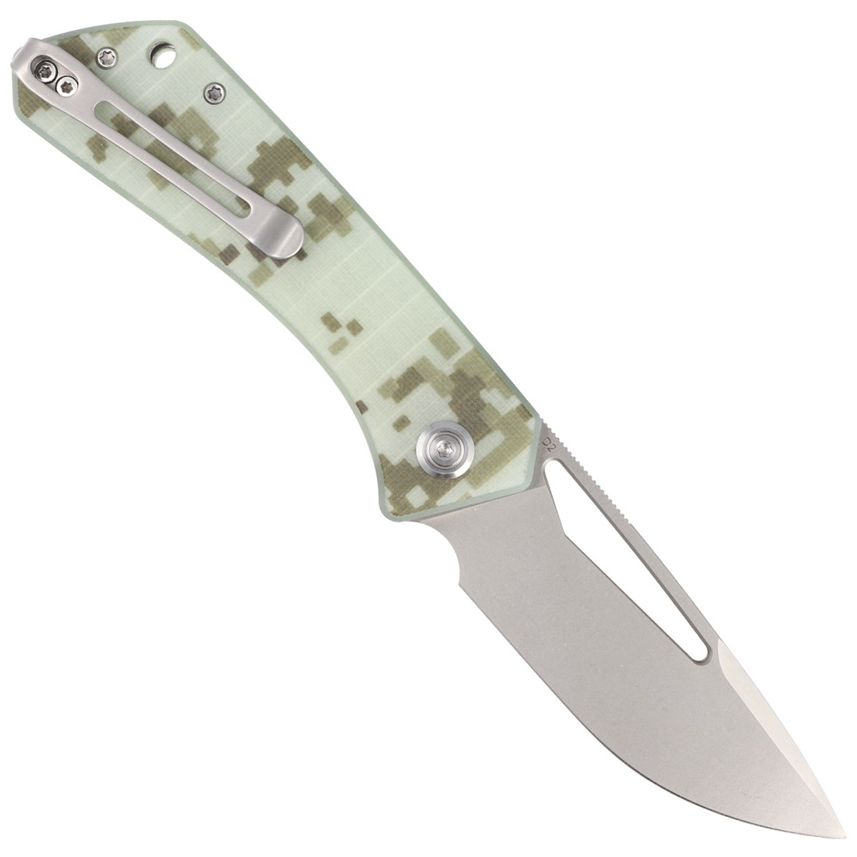 Thalia Camo G10, Beadblasted is a versatile folder designed for everyday use. Drop point blade made of excellent D2 tool steel, long-lasting sharpness and damage. The Front Flipper opening mechanism and the hole in the clod allow for quick, smooth unfolding of the blade with one hand. The handle made of durable G10 composite offers excellent grip in all conditions. The ergonomic design ensures a secure grip. Sturdy construction, high-precision manufacturing and reliability in daily use.