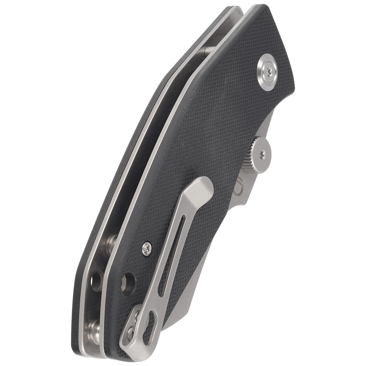 Handle - G10 (pressure-pressed fiberglass with synthetic resin) facings, textured to improve grip confidence, bolted to the knife's steel frame. The so-called open-backed design without the typical backspacer, fastened together with steel spacers for easy cleaning. The simple, sturdy design gives assurance of many years of use. A deep finger undercut (fore finger groove) improves grip security. The pivot axis is decorated with a stylized manufacturer's logo. A two-position (right/left) steel deep-carry clip allows you to carry the knife discreetly in your pocket in tip-up position (blade tip up). Above the clip a lanyard hole, a hole for threading a safety or decorative cord.