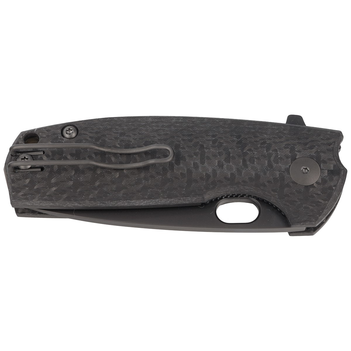 Handle - facings made of Carbon Fiber, a lightweight, weatherproof, chemical-resistant material. Chamfered edges of the covers eliminate sharp edges and surface texturing improves grip confidence. The solid backspacer to which the facings are attached guarantees the rigidity and strength of the entire structure. A two-position (right/left) lightweight wire clip allows the knife to be carried in tip-up position, with the tip of the blade upward. Above the clip a hole for threading a safety or decorative cord.