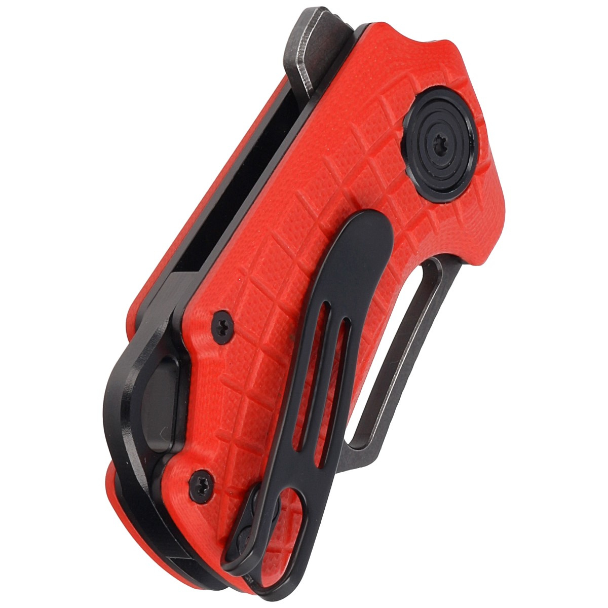 Handle - red G10 (pressure-pressed fiberglass with synthetic resin) facings, textured to improve grip confidence, are bolted to the knife's steel frame. The whole is stiffened by a solid steel backspacer. The simple, sturdy design gives you the assurance of many years of use. A deep finger undercut (fore finger groove) improves grip security. A two-position (right/left) metal deep carry clip allows you to carry the knife discreetly in your pocket in tip-up (blade tip up) position. Above the clip a lanyard hole, a hole for threading a safety or decorative cord.