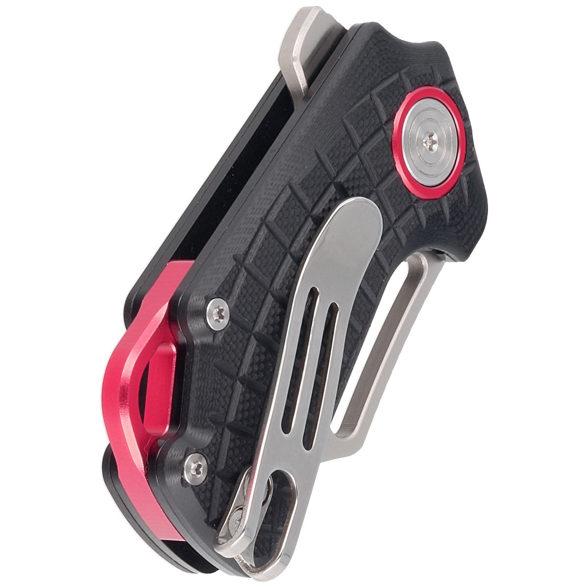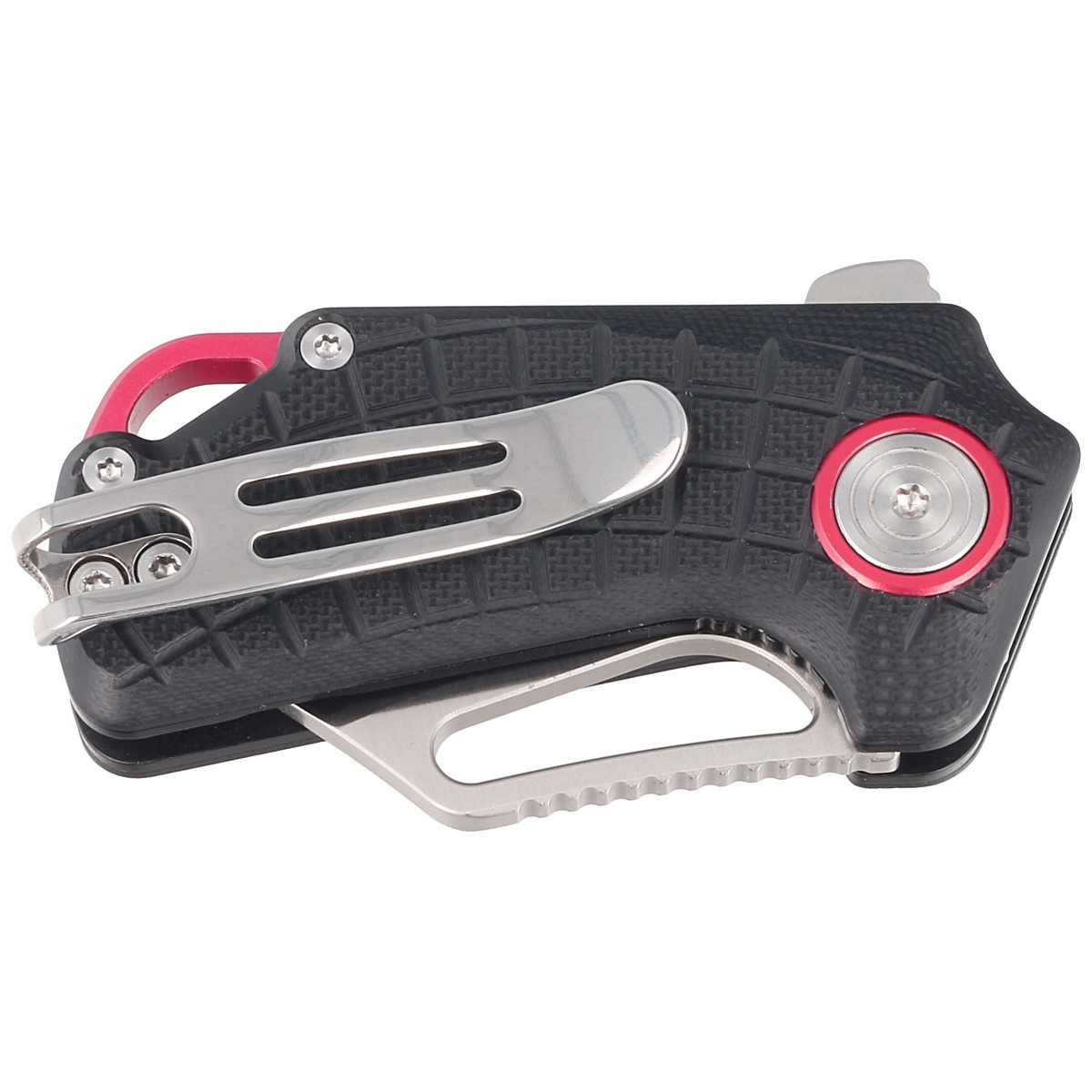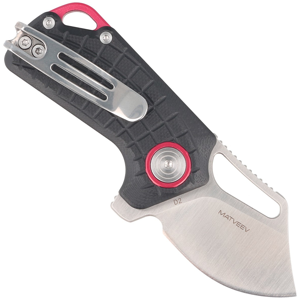 Handle - black G10 (pressure-pressed fiberglass with synthetic resin) facings, textured to improve grip confidence, are bolted to the knife's steel frame. The whole is stiffened by a solid steel backspacer. The simple, sturdy design gives assurance of many years of use. A deep finger undercut (fore finger groove) improves grip security. The pivot axis is decorated with a decorative red circle. A two-position (right/left) metal deep-carry clip allows you to carry the knife discreetly in your pocket in tip-up position (blade tip up). Above the clip a lanyard hole, a hole for threading a safety or decorative cord.