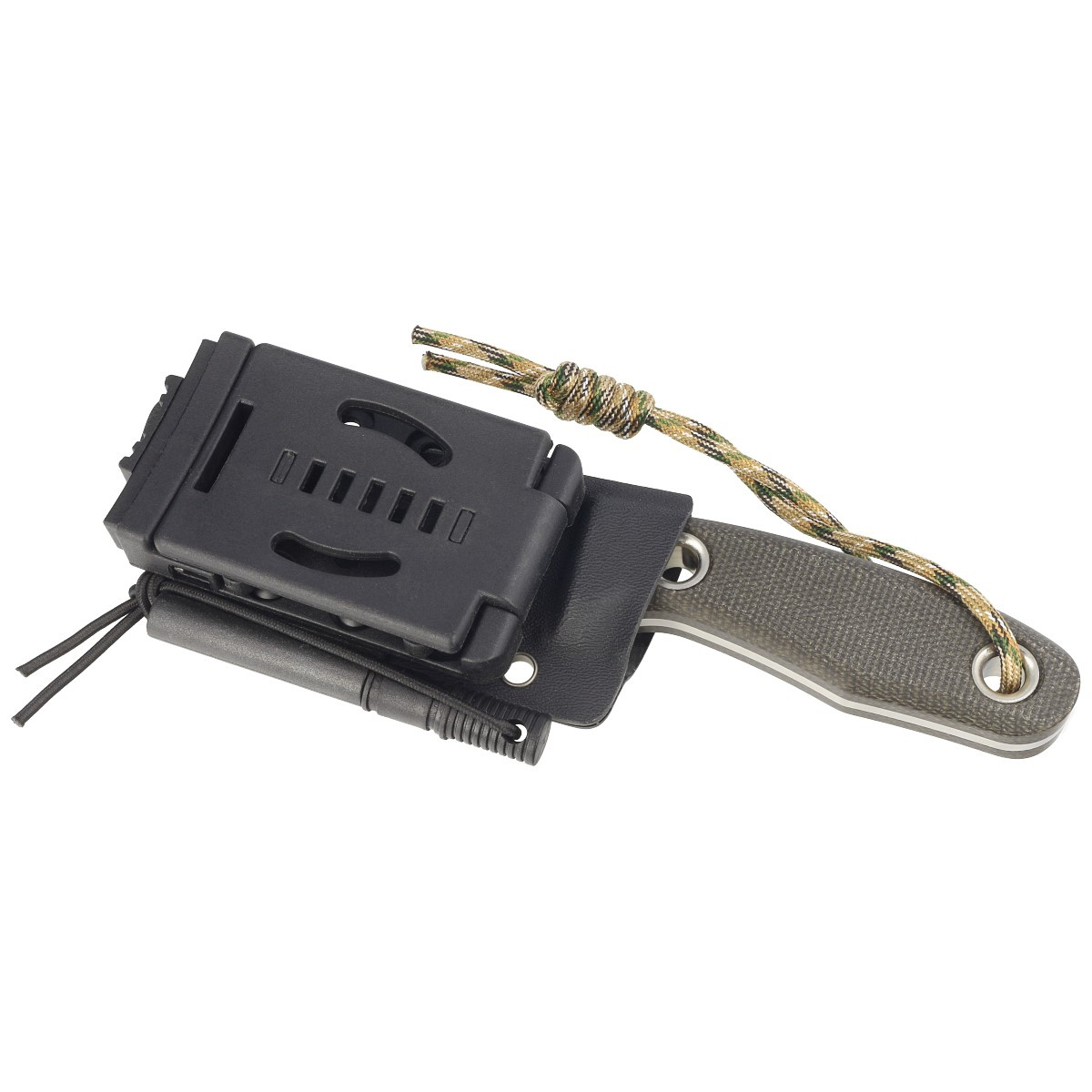 Sheath - made of kydex plastic. Allows quick retrieval of the knife and protects it from falling out and moisture. The holster is equipped with a multi-position handle that allows you to carry on your belt or on your equipment.