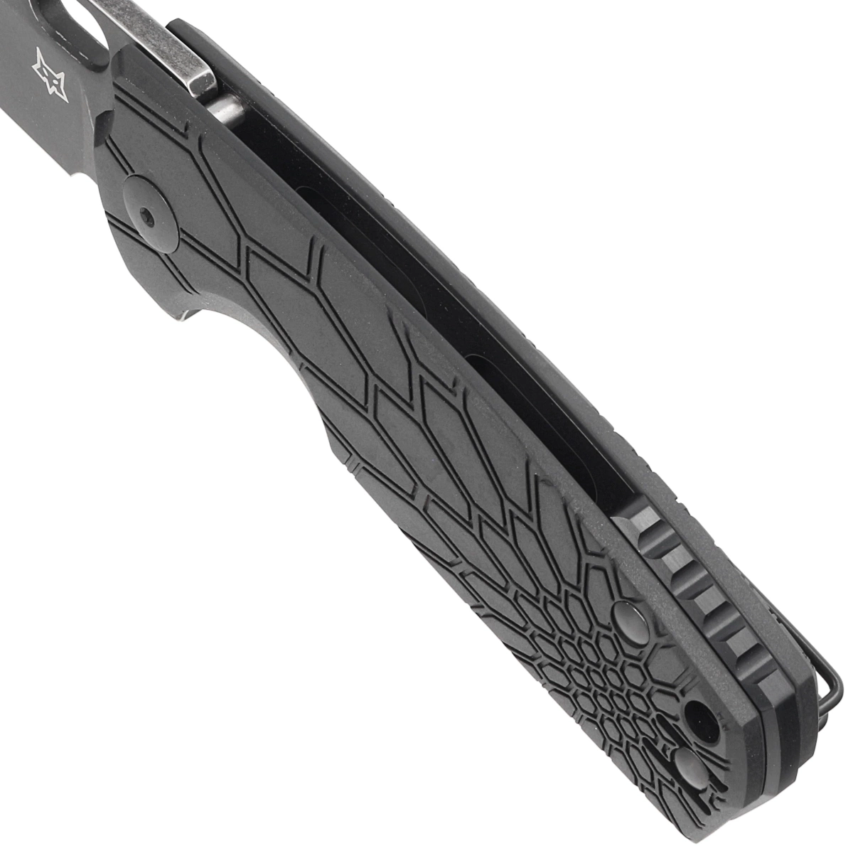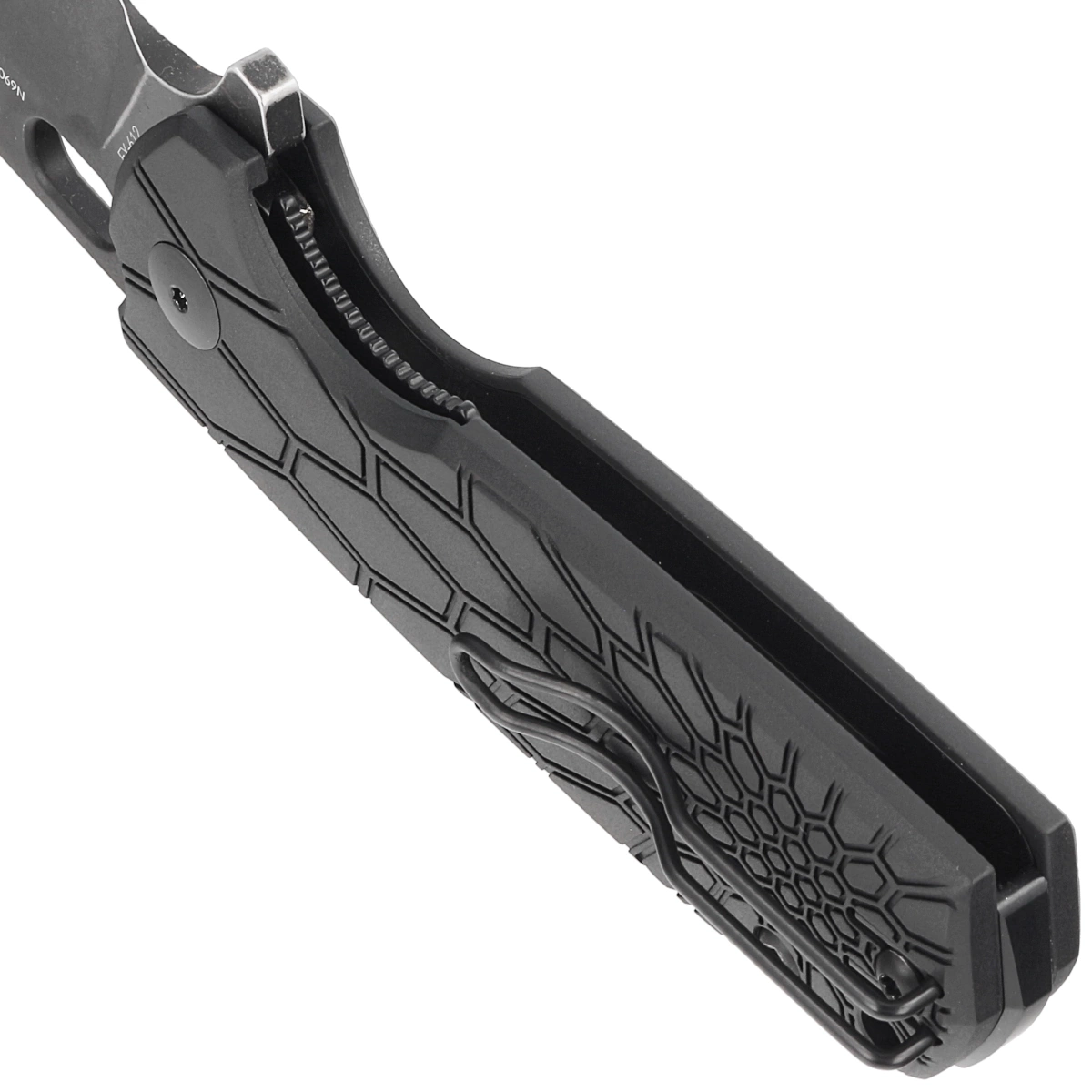 Handle - grips made of FRN (Fiberglass Reinforced Nylon), a lightweight material, insensitive to weather conditions, resistant to chemicals and mechanical damage. Chamfered edges of the covers eliminate sharp edges and surface texturing improves grip security. The solid backspacer to which the grips are attached guarantees the rigidity and strength of the entire structure. A two-position (right/left) lightweight wire clip allows the knife to be carried in tip-up position, with the tip of the blade upward. Above the clip a hole for threading a safety or decorative cord.