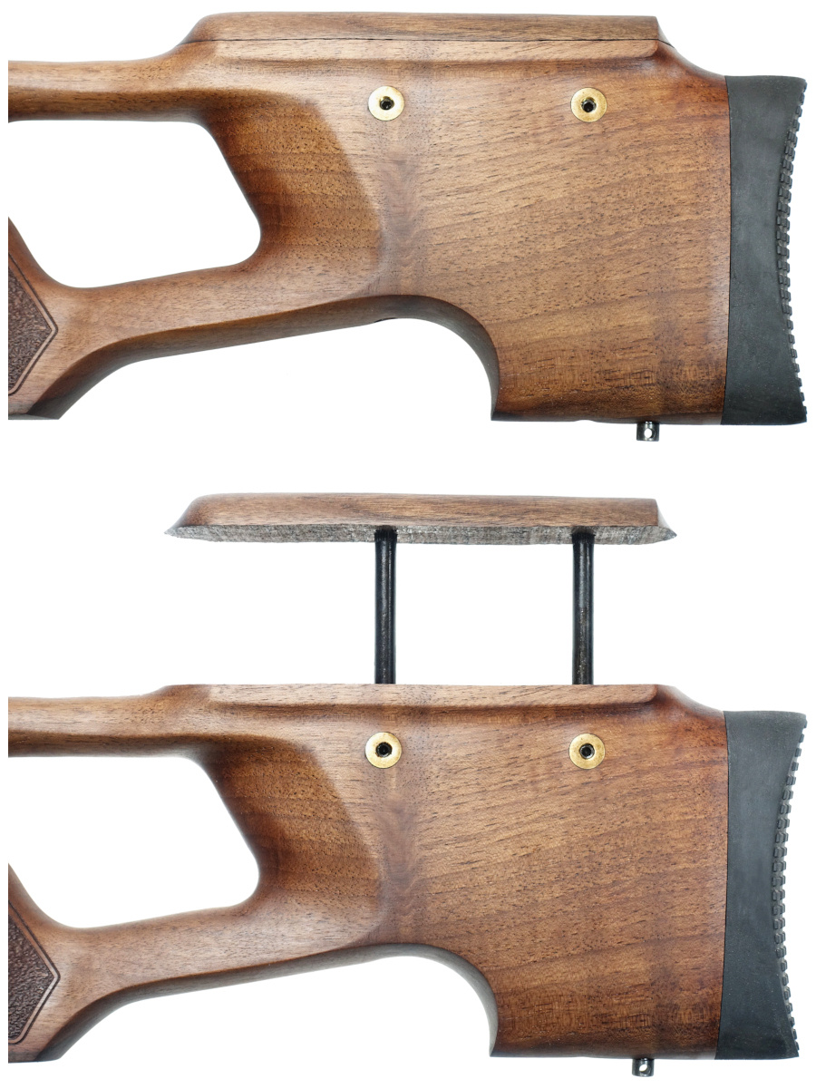 Stock – ambidextrous design with a ThumbHole (TH) configuration, crafted from premium selected Turkish walnut. The contoured cheek pad facilitates comfortable handling and precise aiming. A rubber butt pad absorbs recoil energy.