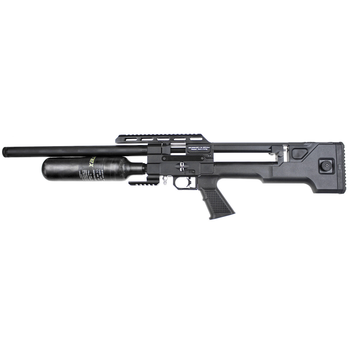 Reximex Throne Gen2 Carbon, modern PCP air rifle in the version known for its offset chamber and magazine behind the trigger Bullpup z lightweight carbon fiber cartridge. By using a cradleless, obtained compact dimensions of the rifle, while maintaining the normal length of the barrel to guarantee accuracy and range, as well as the weight reduction typical of this design for better control. Throne Gen2 is equipped with lever tensioning Side Lever, shot power regulator, knob trigger mechanism adjustment and a barrel with an integrated sound suppressor. Davailable in calibers: .177 (4.5 mm), .22 (5.5 mm), .25 (6.35 mm).
